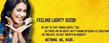 When users access www.takeitlightly.com, the website “unloads” all the problems and tensions that the youth tends to face on a daily basis. Finally, the site moves onto a page where Genelia D’Souza is holding a Perk and announces that there are no heavy duty fundas or quick-fix solutions on the site and hence there is no site! In fact, the entire site is a single static webpage.