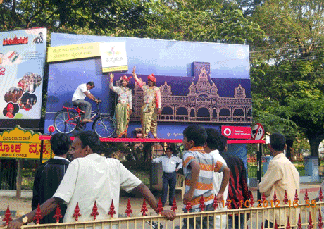 'Cycle to light up the Mysore Palace' is an initiative launched to spread awareness and promote cycling in Mysore. To get the message across, Vodafone picked a non-lit OOH site at Ballal Circle, a busy area in Mysore, and built backlit boxes for a hoarding featuring the Mysore Palace. A cycle was placed in the front of the hoarding. Vodafone appointed promoters to pedal the cycle, by which the power generated lit up the boxes on the hoarding. Besides this hoarding with the cycle-powered lighting, the campaign employed several hoardings across Mysore.