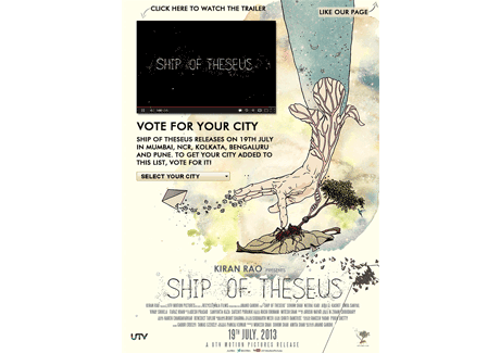 Ship of Theseus, a film under the Disney UTV Studios banner, releases today. The film directed by Anand Gandhi releases in six cities,five of which were pre-planned - Mumbai, NCR, Bengaluru, Pune and Kolkata. The studio decided to release the film in Hyderabad followinga 'Vote for your city' campaign on Facebook.